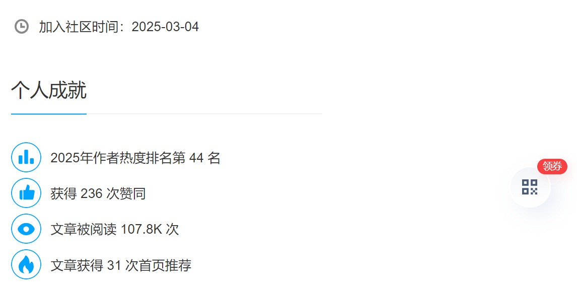 我给你们看下,我是2025年3月4日加入社区的,我的文章被读了107.8K次,获得了31次首页推荐。我是三月加入的,活跃了9个月,这很合理。