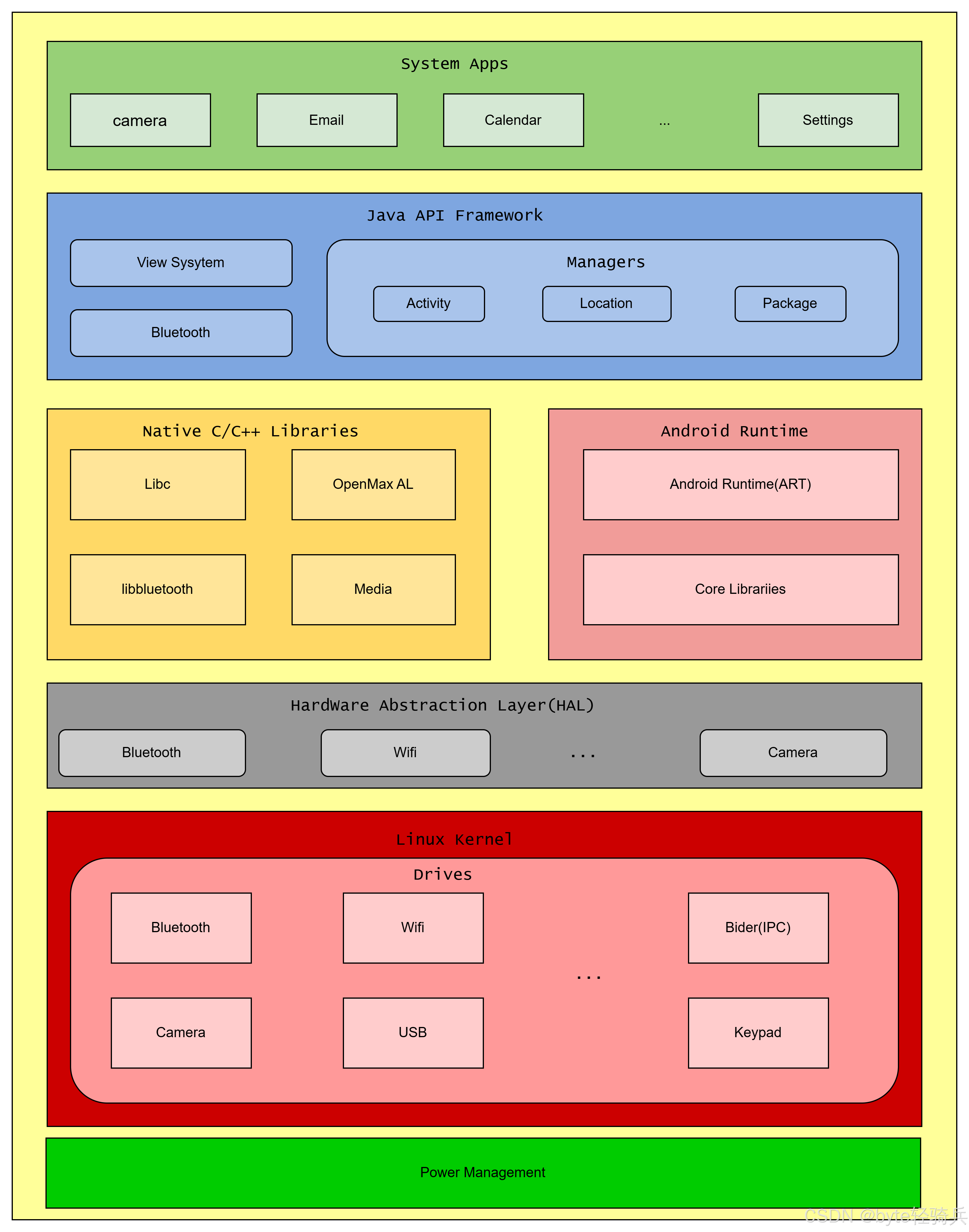 - 作用:这些C/C++库通过应用程序框架层向上层应用提供接口,使得开发者能够利用这些强大的功能来构建丰富多彩的应用程序。
