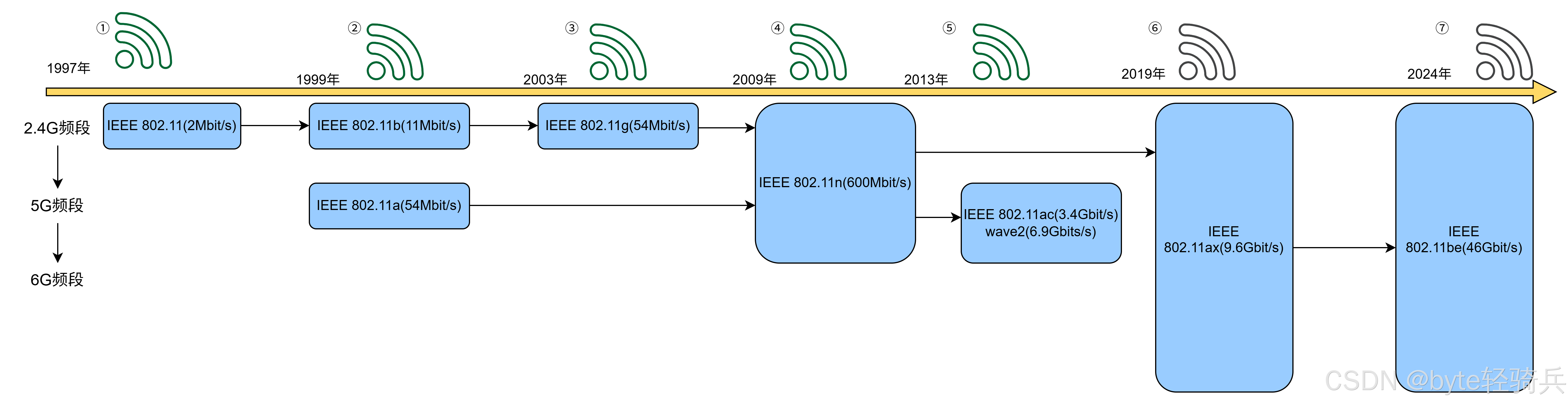 - IEEE 802.11(1997年):作为第一个无线局域网标准,也被称为原始标准或802.11-1997标准。,IEEE 802.11定义了WLAN的物理层和媒体访问控制层(MAC)的基本规范,支持最高传输速率为2Mbps,主要工作在2.4GHz频段。