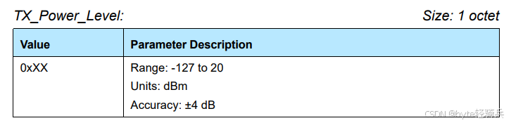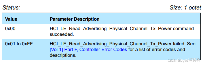 0x00表示命令成功执行,广播物理信道的发射功率等级将被正确读取。0x01 to 0xFF表示命令执行失败,错误码可以参考蓝牙核心规范或设备的具体文档进行解释。蓝牙Controller错误代码全面概览-CSDN博客Advertising_Channel_Tx_Power_Level参数用于提供广播物理信道上数据包发送时的实际功率信息。它对于确定通信范围、信号质量和电池寿命等至关重要。