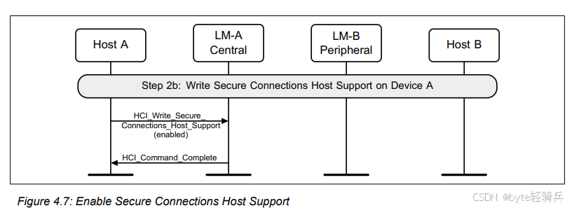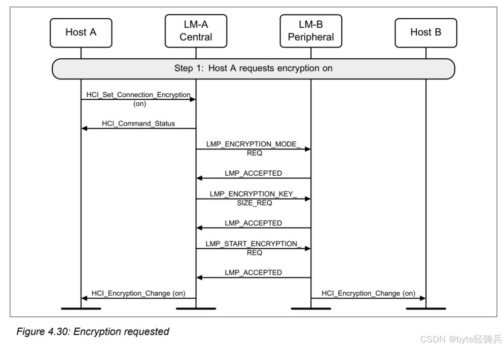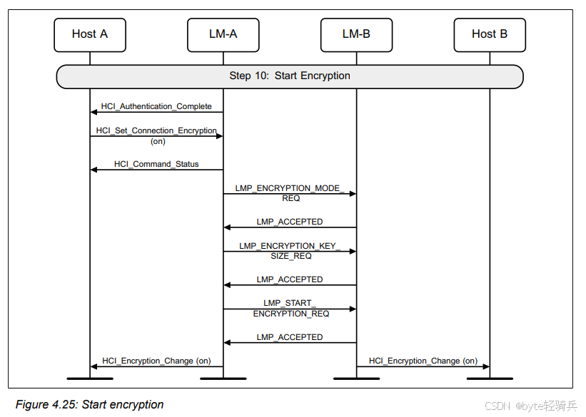 在链路密钥(link key)被通知到主机之后,“HCI_Authentication_Requested” 命令将会伴随着 “HCI_Authentication_Complete” 事件完成执行。至此,主机就能够运用标准方法来开启加密功能了。