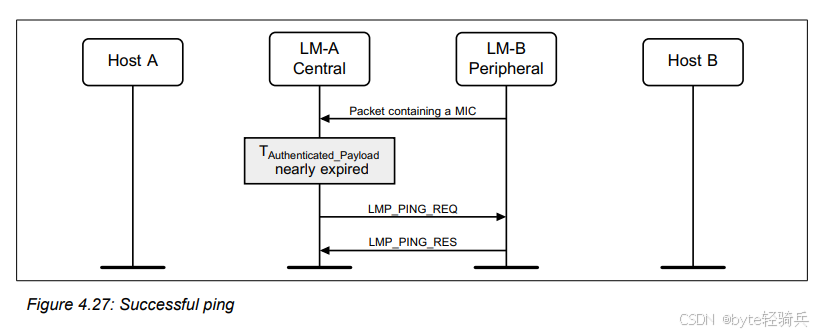 在蓝牙通信中,当认证有效载荷超时(Authenticated Payload Timeout)即将到期时,链路管理器(Link Manager)会发送一个LMP_PING_REQ协议数据单元(PDU)给远程设备,以强制其发送一个包含消息完整性校验(MIC,Message Integrity Check)的数据包。当在经过认证的有效载荷超时时间内没有接收到包含 MIC 的数据包时,主机将被通知定时器已过期。