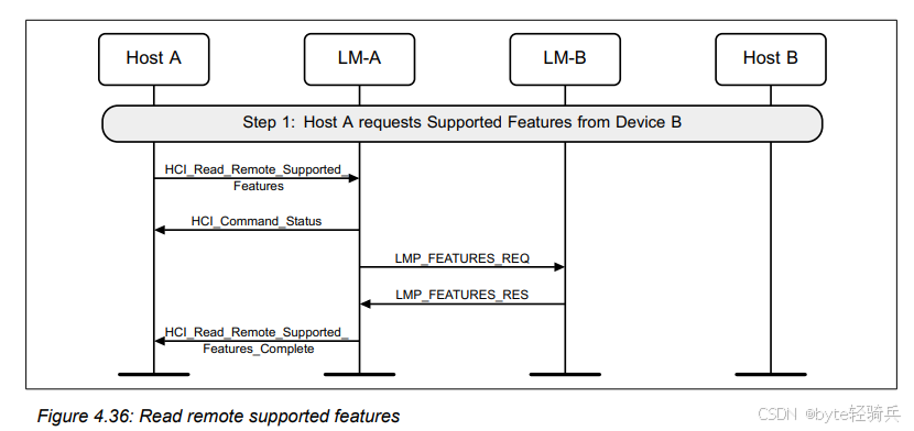 HCI_Read_Remote_Supported_Features命令来请求Device B的支持特性。这个命令包含了Device B的蓝牙地址(BD_ADDR),以指定要查询的设备。HCI_Command_Status事件,确认HCI_Read_Remote_Supported_Features命令已经被成功发送并正在处理中。LMP_FEATURES_REQ消息给Device B,请求其支持的特性。LMP_FEATURES_RES消息返回其支持的特性给Host A。HCI_Read_Remote_Supported_Features_Complete事件,该事件包含了Device B的支持特性。这个事件是由Host A的蓝牙控制器生成的,作为对HCI_Read_Remote_Supported_Features命令的响应。通过HCI_Read_Remote_Supported_Features命令和后续的LMP消息交换,Host A能够成功地获取到Device B的支持特性。这些信息对于后续的蓝牙通信配置和优化是非常重要的。
