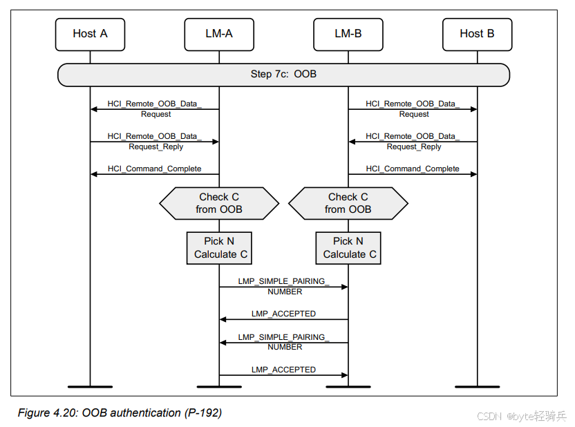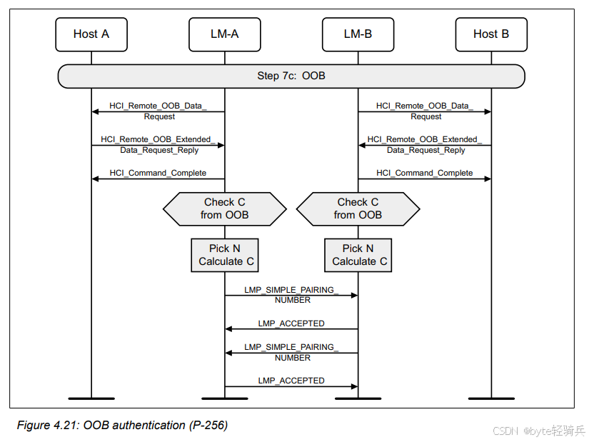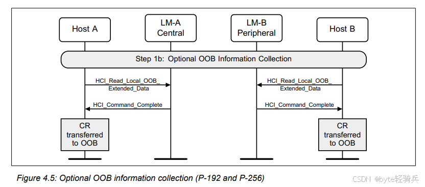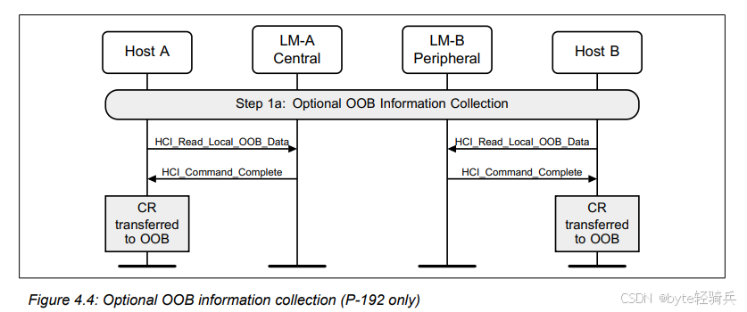 OOB(Out of Band)信息收集是指在蓝牙设备间进行OOB信息交换之前,设备的主机(Host)从控制器(Controller)中获取必要的OOB信息(如C值和R值)的过程。这些信息通常用于后续的设备配对和认证过程,以增强连接的安全性。