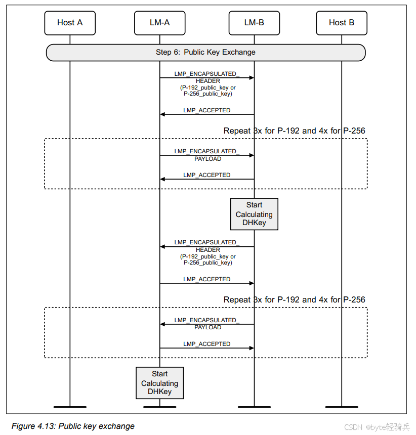 接下来,两个设备之间会进行公钥交换。一旦某个设备接收到了对等设备的公钥,它就能够开始计算迪菲 - 赫尔曼密钥(Diffie-Hellman Key,简称 DHKey)了。这个密钥将用于后续的加密和认证过程,确保设备之间通信的安全性。