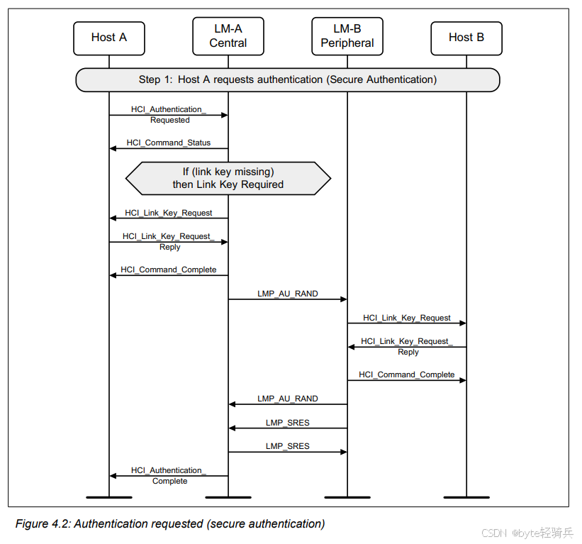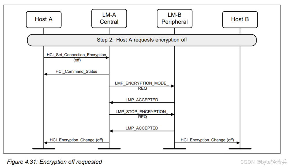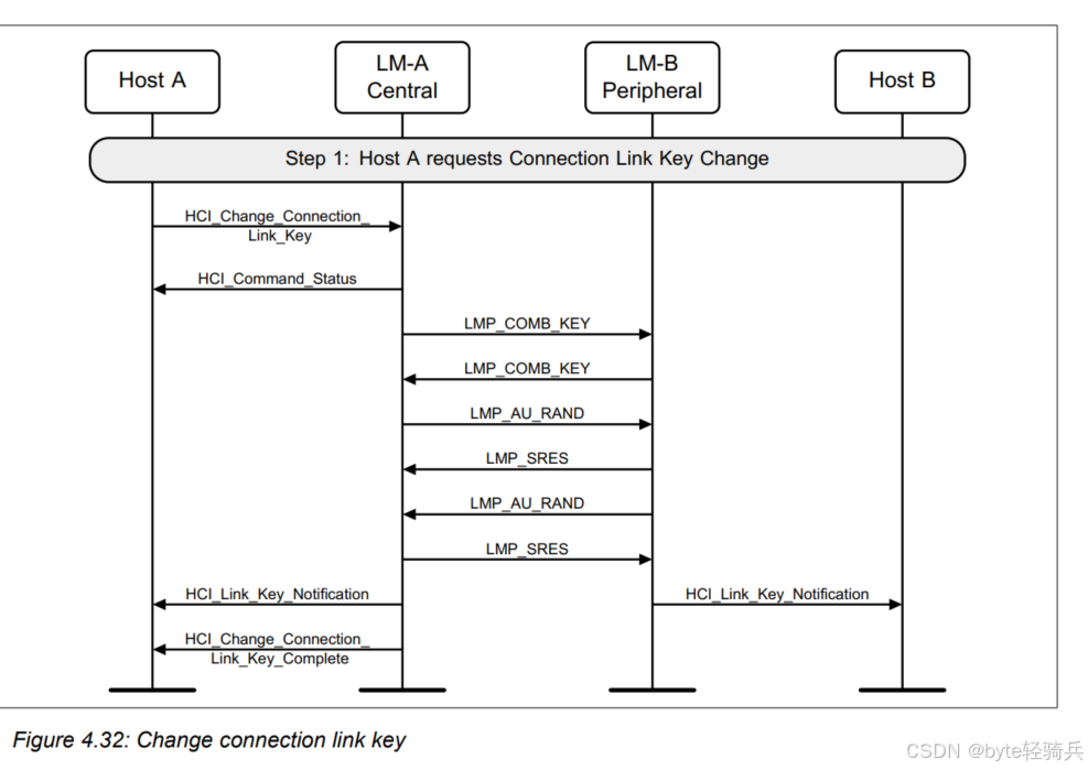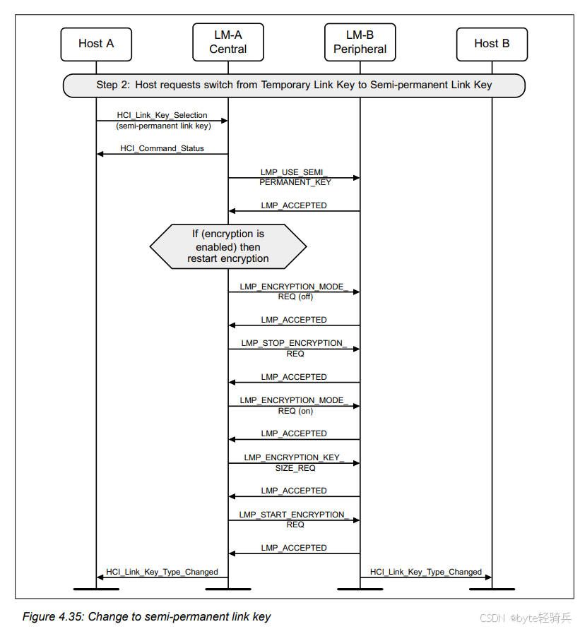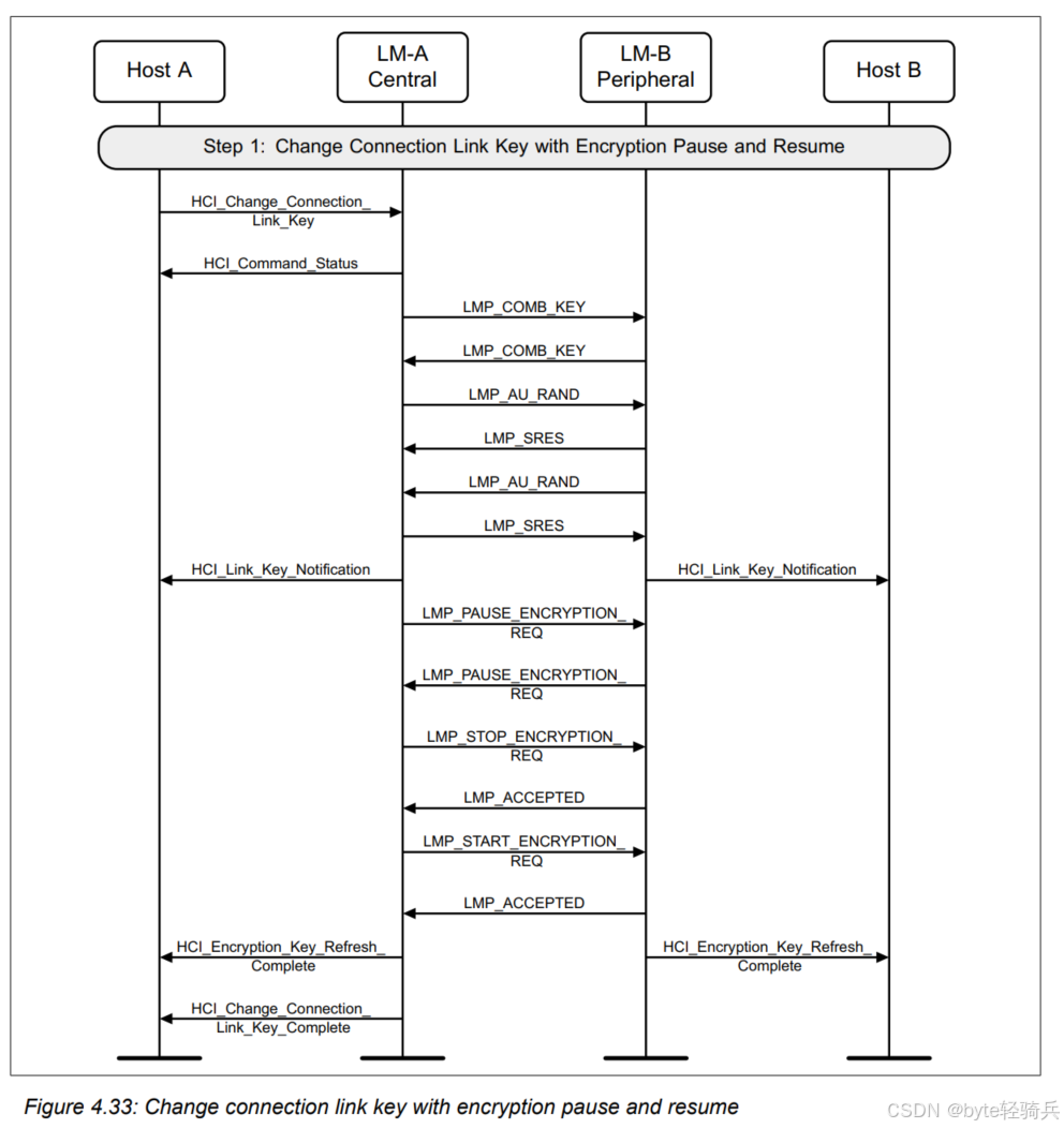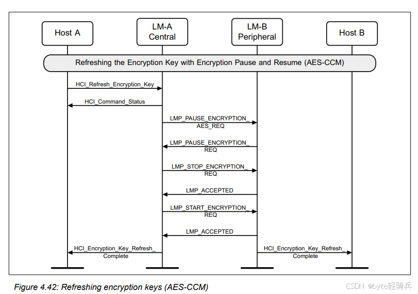 HCI_Refresh_Encryption_Key命令来请求刷新与Host B(作为外围设备)之间的加密密钥。LMP_PAUSE_ENCRYPTION_REQ消息给LM-B,请求暂停加密。LMP_PAUSE_ENCRYPTION_REQ消息给LM-A(尽管在实际协议中,这可能是一个单独的确认消息,但为简化流程,这里用相同的消息表示)。LMP_STOP_ENCRYPTION_REQ消息来明确表示加密已被暂停。LMP_START_ENCRYPTION_REQ消息给LM-B,请求恢复加密并同时使用新密钥。LMP_ACCEPTED消息进行确认。HCI_Encryption_Key_Refresh_Complete事件通知。通过这个流程,两个蓝牙设备可以在不中断通信的情况下,安全地它们的刷新加密密钥。这对于需要长期保持安全通信的蓝牙应用场景来说是非常重要的。