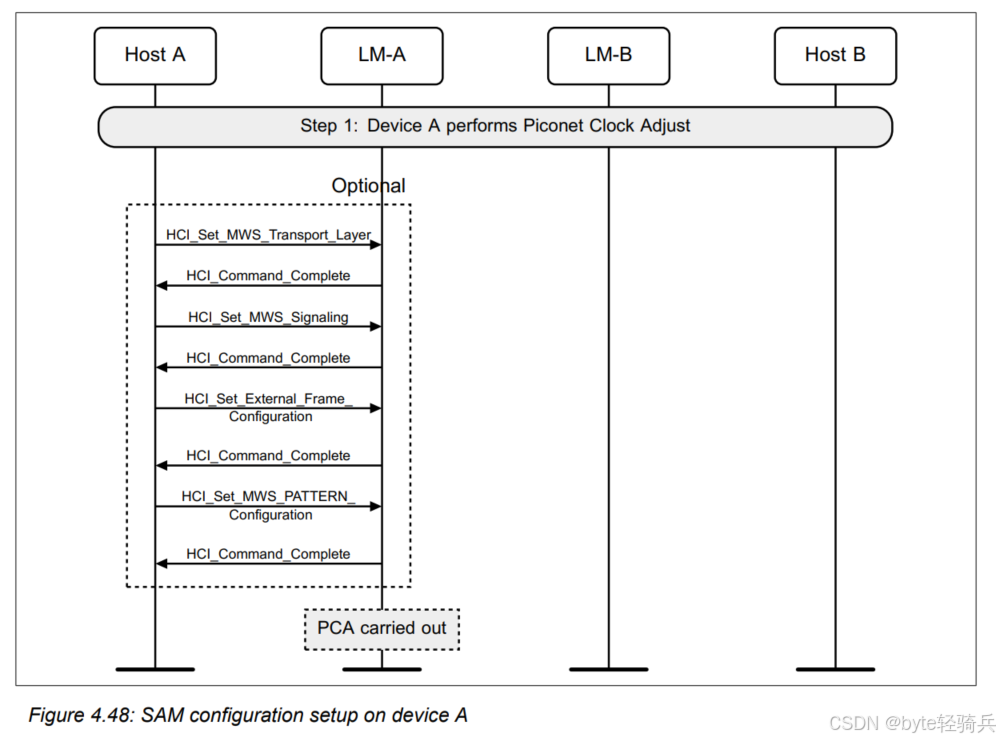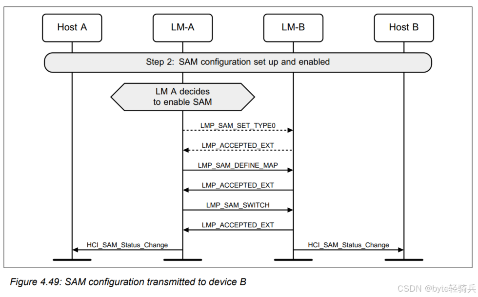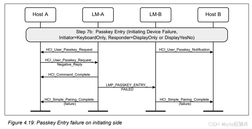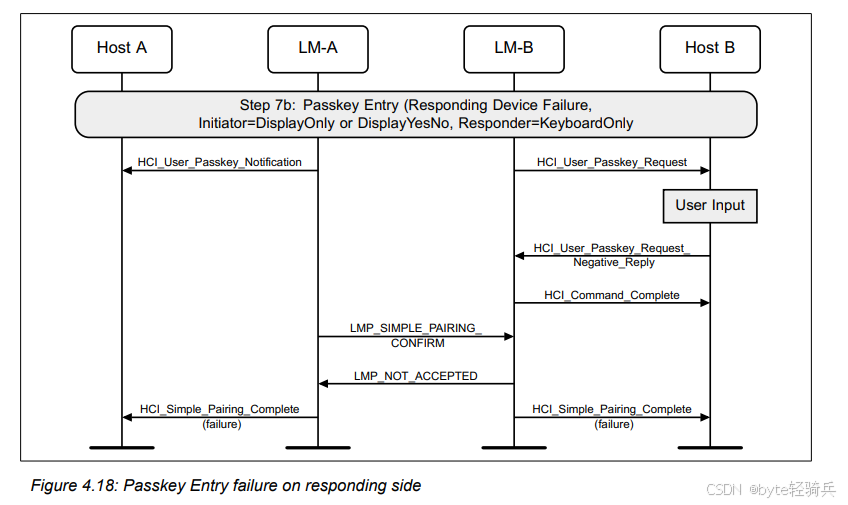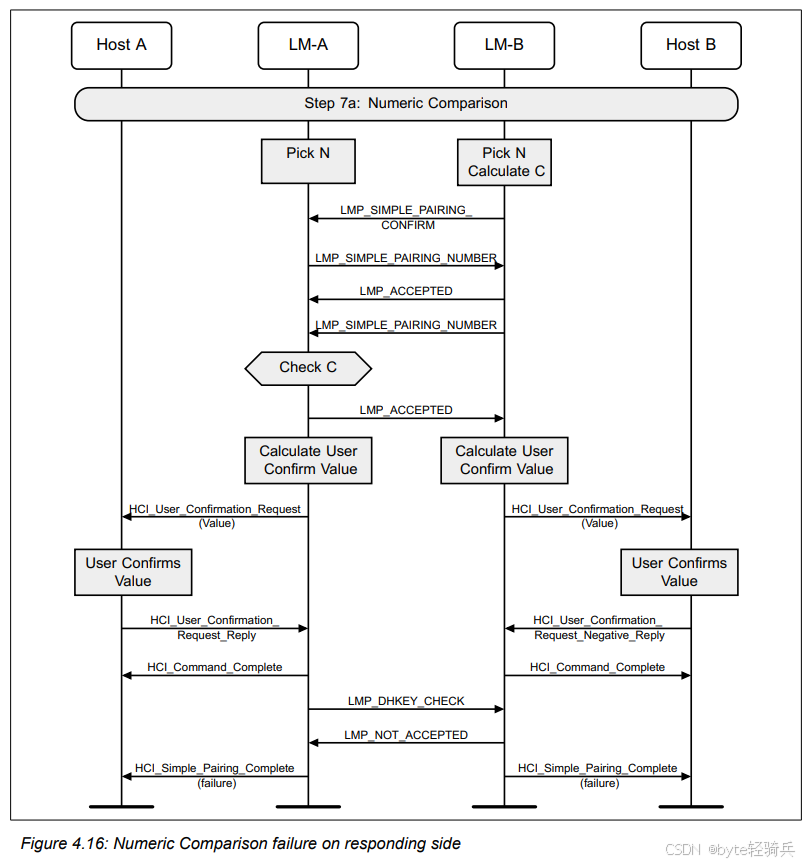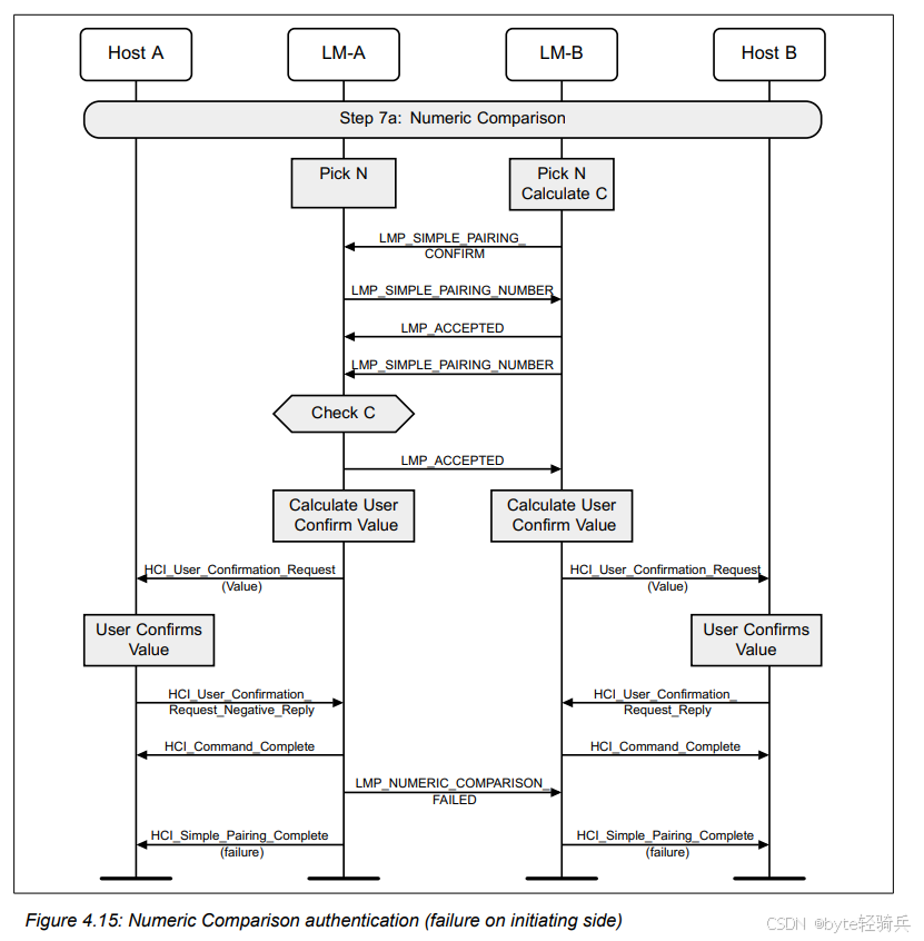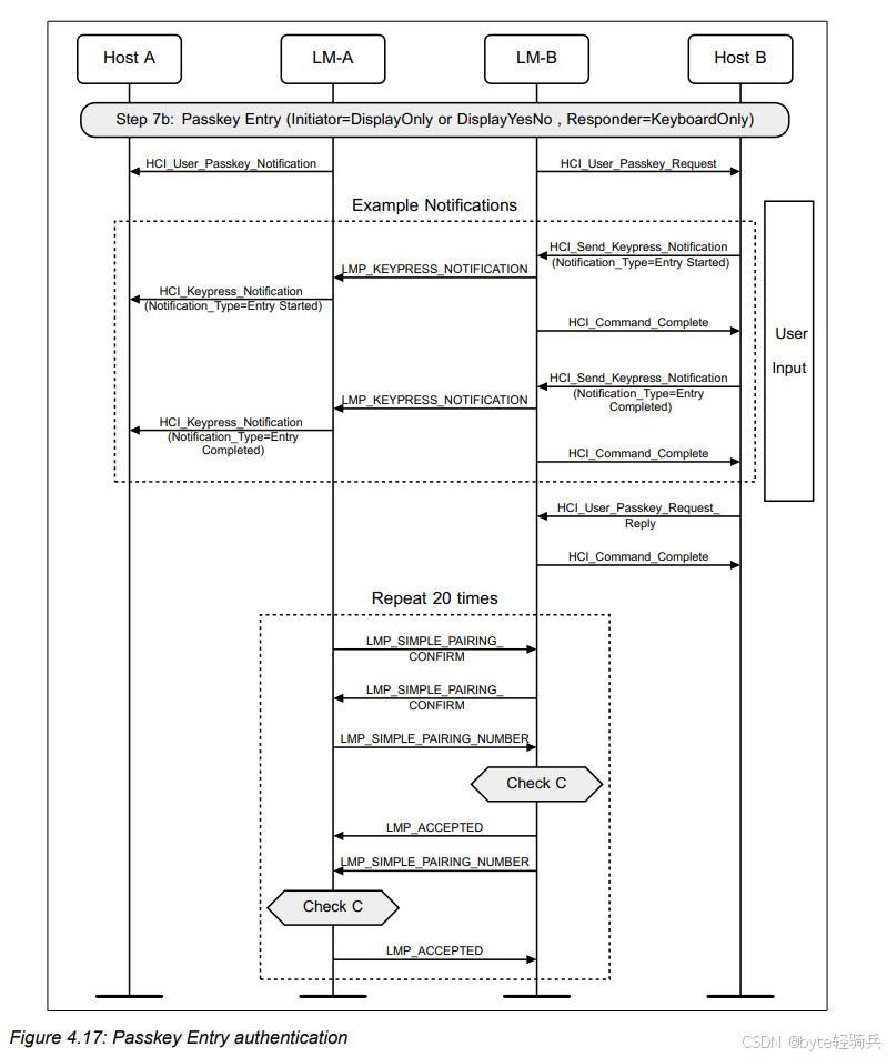 HCI_Refresh_Encryption_Key命令来请求刷新与Host B(作为外围设备)之间的加密密钥。LMP_PAUSE_ENCRYPTION_REQ消息给LM-B,请求暂停加密。LMP_PAUSE_ENCRYPTION_REQ消息给LM-A(尽管在实际协议中,这可能是一个单独的确认消息,但为简化流程,这里用相同的消息表示)。LMP_STOP_ENCRYPTION_REQ消息来明确表示加密已被暂停。LMP_START_ENCRYPTION_REQ消息给LM-B,请求恢复加密并同时使用新密钥。LMP_ACCEPTED消息进行确认。HCI_Encryption_Key_Refresh_Complete事件通知。通过这个流程,两个蓝牙设备可以在不中断通信的情况下,安全地它们的刷新加密密钥。这对于需要长期保持安全通信的蓝牙应用场景来说是非常重要的。