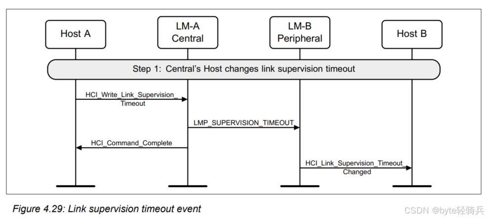 HCI(主机控制器接口,Host Controller Interface)是蓝牙协议栈中用于主机和蓝牙控制器之间通信的接口。当外设接收到LMP_SUPERVISION_TIMEOUT PDU并成功更改了链路监督超时值时,它会通过HCI层向主机发送一个HCI_Link_Supervision_Timeout_Changed事件。这个事件通知主机链路监督超时值已经被更改,并可能包含新的超时值信息。