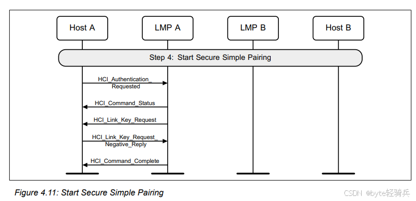 HCI_Authentication_Requested命令后,控制器会生成一个链路密钥(Link Key)请求。链路密钥是用于加密蓝牙设备之间通信的密钥。HCI_Link_Key_Request_Negative_Reply命令,表示它无法提供链路密钥。这个回复是启动安全简单配对过程的触发点。HCI_Link_Key_Request_Negative_Reply命令,它将知道需要通过安全简单配对过程来生成一个新的链路密钥。这个过程通常包括交换随机数、生成密钥、进行认证等步骤,以确保两个设备之间能够安全地建立连接。当主机确定需要启动安全简单配对时,它会向控制器发出