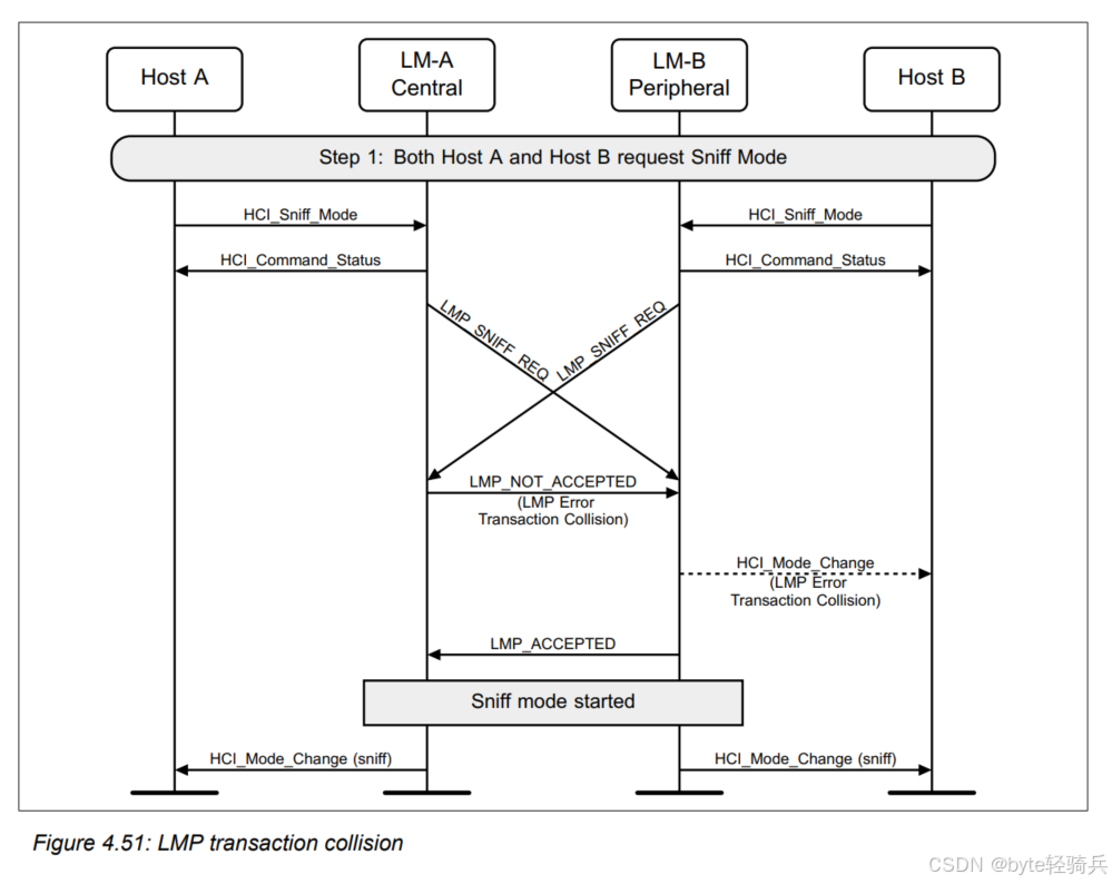 在蓝牙通信中,中心设备(Central)和外围设备(Peripheral)的链路管理器(Link Manager)有可能会同时发起相同的链路管理协议(LMP,Link Manager Protocol)事务,进而产生冲突的情况。这里以请求嗅探模式(Sniff Mode)为例,展示从主机发起请求到链路层处理以及最终结果反馈的整个流程,说明事务冲突时的表现及相应处理结果。