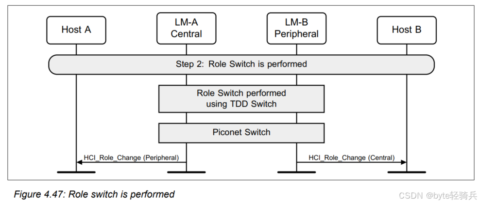 通过执行时分双工(TDD)切换和微微网(piconet)切换来完成角色切换。最后,双方都会发送一个 HCI_Role_Change 事件。