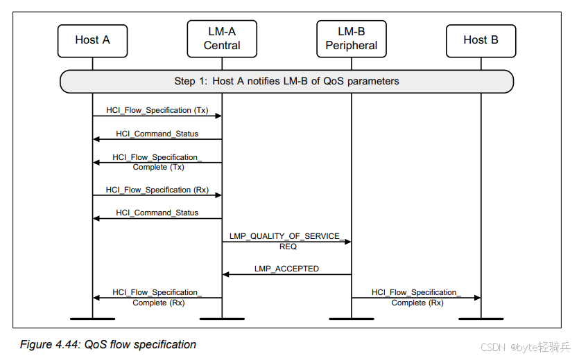 HCI_Flow_Specification命令给其控制器(LM-A),通知LM-A关于期望的QoS参数和流规范。这些参数可能包括服务类型、令牌速率、最大传输单元(MTU)大小、服务数据单元(SDU)间隔等。HCI_Command_Status事件,确认命令已被接收并正在处理。HCI_Flow_Specification_Complete事件(针对Tx方向),表明传输方向的QoS设置已完成。HCI_Flow_Specification命令给LM-A,这次是通知关于接收(Rx)方向的QoS参数。HCI_Flow_Specification_Complete事件(针对Rx方向)。LMP_QUALITY_OF_SERVICE_REQ消息给LM-B(作为外围设备的控制器),请求与远程设备建立相应的QoS。LMP_ACCEPTED消息作为响应。HCI_Flow_Specification_Complete事件来确认接收方向的QoS设置也已完成。通过这个流程,Host A能够与其远程设备(Host B)建立和维护所需的QoS和流规范,从而确保数据传输的可靠性和效率。