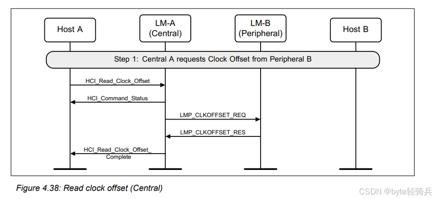 HCI_Read_Clock_Offset命令来请求外围设备(Device B,或称为Host B的蓝牙模块)的时钟偏移。这个命令包含了外围设备的蓝牙地址(BD_ADDR)和连接句柄(Connection Handle),以指定要查询的设备和当前的连接。HCI_Command_Status事件,确认HCI_Read_Clock_Offset命令已经被成功发送并正在处理中。LMP_CLKOFFSET_REQ消息给外围设备,请求其时钟偏移。LMP_CLKOFFSET_RES消息返回其时钟偏移给中央设备。HCI_Read_Clock_Offset_Complete事件,该事件包含了外围设备的时钟偏移。这个事件是由中央设备的蓝牙控制器生成的,作为对HCI_Read_Clock_Offset命令的响应。外围设备 发起这一请求可能也是出于自身对于时间同步或者优化后续与中央设备连接等方面的需求。比如,外围设备希望自身能更好地与中央设备的时钟进行同步,以便在后续的数据传输等操作中能更精准地配合,或者同样是为了在后续可能的连接场景中利用时钟偏移信息来提升连接效率等,所以启动对中央设备时钟偏移值的读取流程。