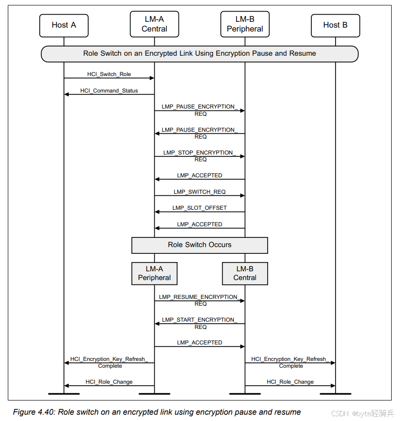 在角色切换过程中,当加密被暂停后,一旦角色切换完成,加密也会被恢复。最终,在双方都会发送一个HCI_Role_Change事件,以通知主机设备角色已经成功切换。