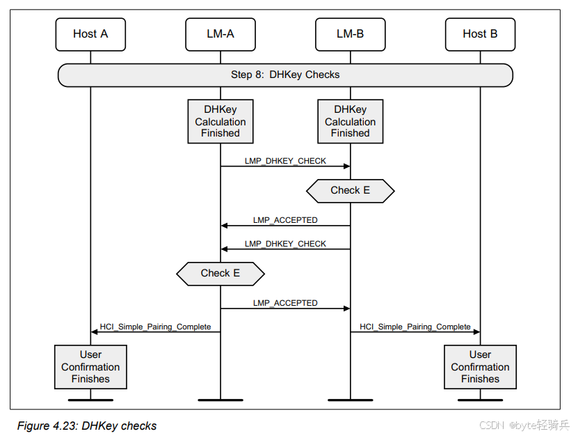 需要注意的是,虽然DHKey在公钥交换后就开始计算,但它并不是立即需要的。实际上,它直到配对过程的第8步(即加密和认证步骤)才会被使用。因此,在计算DHKey的过程中,设备可以继续进行其他配对相关的操作。
