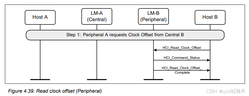 HCI_Read_Clock_Offset命令。HCI_Command_Status事件和HCI_Read_Clock_Offset_Complete事件,而不发送任何LMP PDUs(协议数据单元)。通过HCI_Read_Clock_Offset命令和后续的LMP消息交换(或由控制器直接返回的事件),中央设备能够成功地获取到外围设备的时钟偏移。这些信息对于优化蓝牙连接建立过程和提高通信效率是非常重要的。