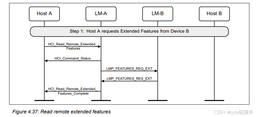 HCI_Read_Remote_Extended_Features命令来请求Device B的扩展特性。这个命令通常包含远程设备的蓝牙地址(BD_ADDR)和一个页面编号(Page Number),页面编号用于指定要读取的特性页(因为扩展特性可能分为多个页面存储)。HCI_Command_Status事件,确认HCI_Read_Remote_Extended_Features命令已经被成功发送并正在处理中。LMP_FEATURES_REQ_EXT消息给Device B,请求其扩展特性。LMP_FEATURES_RES_EXT消息返回其扩展特性给Host A。HCI_Read_Remote_Extended_Features_Complete事件,该事件包含了Device B的扩展特性。这个事件是由Host A的蓝牙控制器生成的,作为对HCI_Read_Remote_Extended_Features命令的响应。通过HCI_Read_Remote_Extended_Features命令和后续的LMP消息交换,Host A能够成功地获取到Device B的扩展特性。这些信息对于了解远程设备的高级功能和优化蓝牙通信配置是非常重要的。