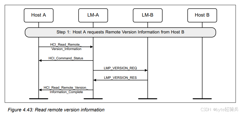 HCI_Read_Remote_Version_Information命令给其控制器(LM-A),请求读取Host B(作为远程设备)的版本信息。HCI_Command_Status事件,确认命令已被接收并正在处理。LMP_VERSION_REQ消息给LM-B(Host B的控制器)。LMP_VERSION_REQ消息后,会检查自己的版本信息,并发送LMP_VERSION_RES消息作为响应。LMP_VERSION_RES消息后,会将远程版本信息传递给Host A。HCI_Read_Remote_Version_Information_Complete事件,这个事件包含了远程设备的完整版本信息。通过这个流程,Host A能够安全地获取Host B的蓝牙版本信息,这对于后续的通信和兼容性检查至关重要。