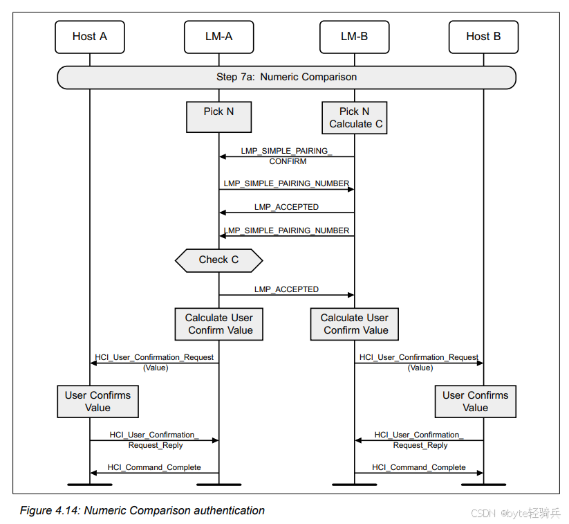在蓝牙SSP配对过程中,数字比较是一个关键的认证步骤。当两个设备都具备输出能力,或者其中一个设备没有输入或输出能力时,就会执行这一步。数字比较的目的是通过显示一个用户确认值来验证两个设备是否正在尝试与正确的对方进行配对。