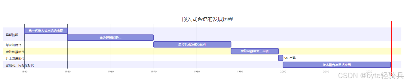 - 应用领域的扩展:随着微控制器的广泛应用,嵌入式系统的应用领域逐渐扩展,从最初的工业控制、武器装备扩展到消费电子、通信设备等多个领域。