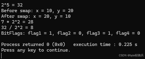 power_of_two 函数通过左移操作计算2的幂次。swap 函数使用异或运算交换两个整数的值,而不使用临时变量。fast_multiply 函数假设传入的power是2的幂次,并通过左移操作实现快速乘法。注意,这里的power参数实际上是2的幂次的指数加1(例如,要计算a * 2^2,传入power为3)。fast_divide 函数假设传入的power是2的幂次,并通过右移操作实现快速除法。同样,power参数是2的幂次的指数加1。BitFlags结构体)来紧凑地存储一组布尔值。每个标志位只占1位,从而节省存储空间。然而,需要注意的是,虽然位运算可以提高性能和减少资源消耗,但它们也可能使代码更加难以理解和维护。因此,在使用位运算时,应该权衡其带来的性能提升和代码可读性之间的平衡。