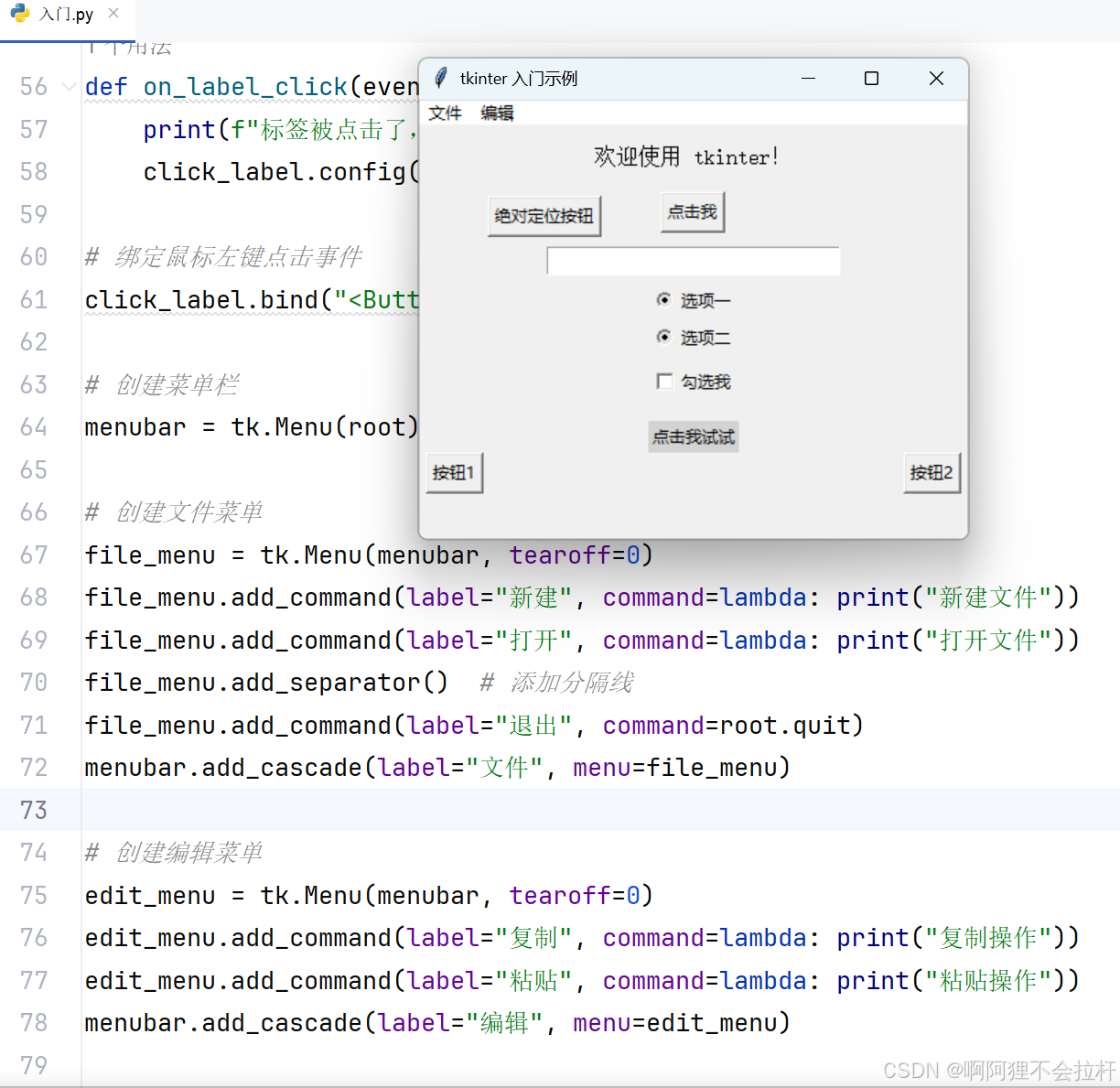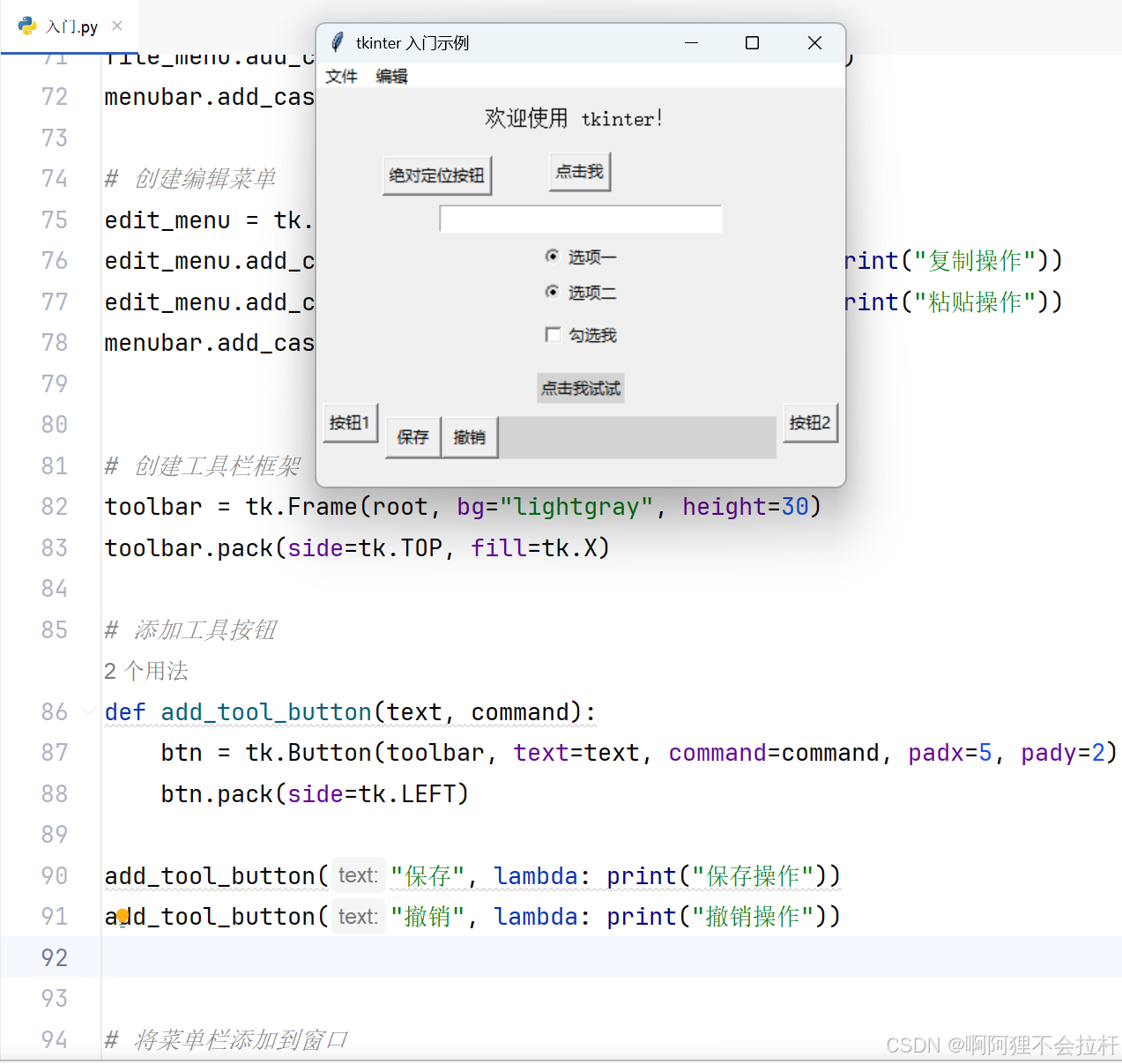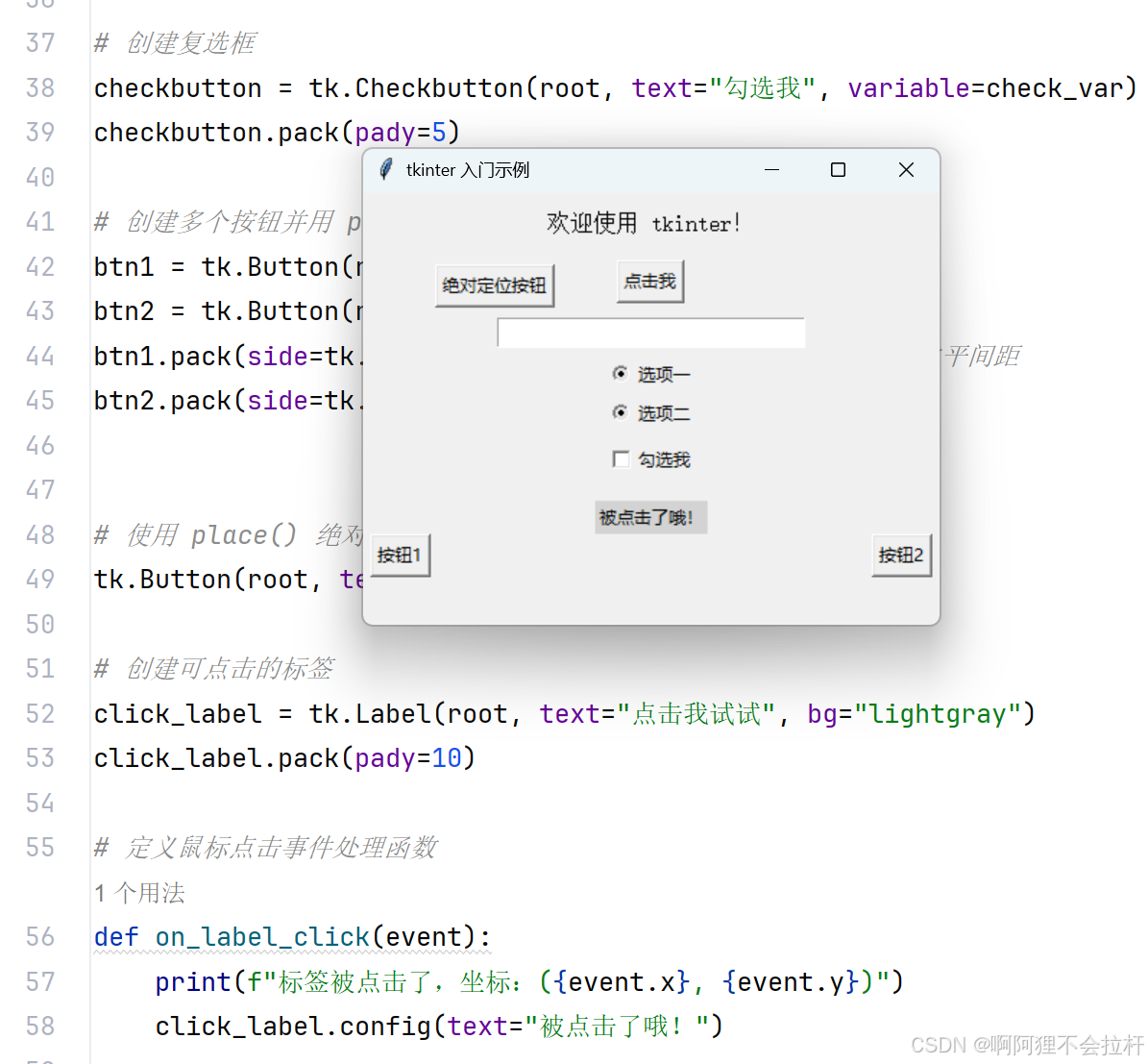 log_file.write(f"Error occurred: {str(e)}\n")通过本文的系统学习,我们从创建基础窗口开始,逐步掌握了 tkinter 中各类组件的使用方法、布局管理技巧、事件处理机制以及界面美化策略,最终构建出一个功能完备且美观的综合示例。在 Python 的 GUI 开发领域,tkinter 是入门的不二之选,它不仅能快速满足日常工具开发的需求,更是深入学习其他高级 GUI 框架(如 PyQt、wxPython 等)的基石。