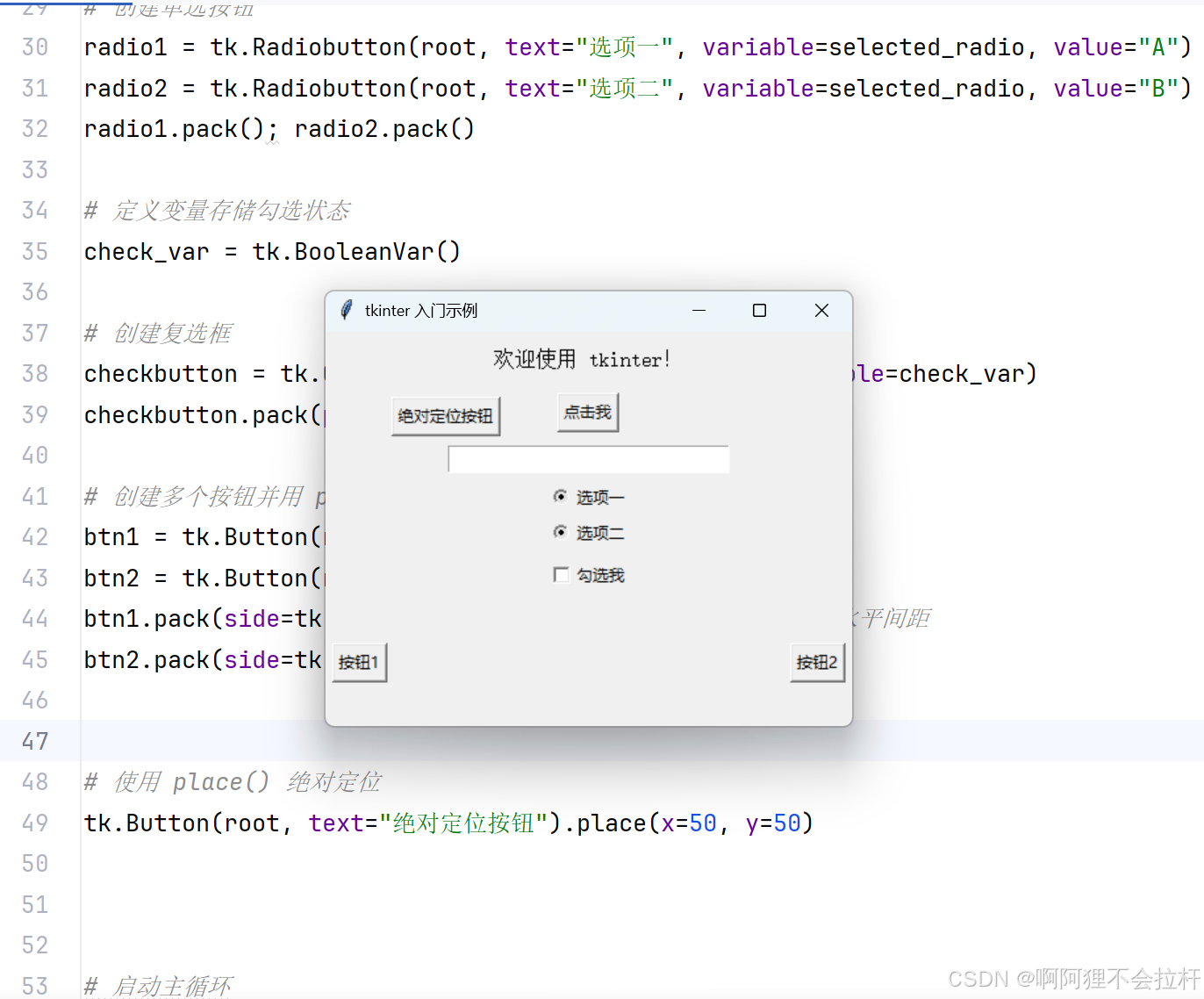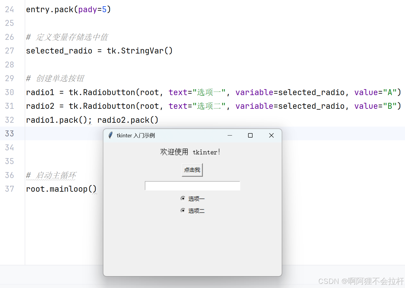 radio1 = tk.Radiobutton(root, text="选项一", variable=selected_radio, value="A")