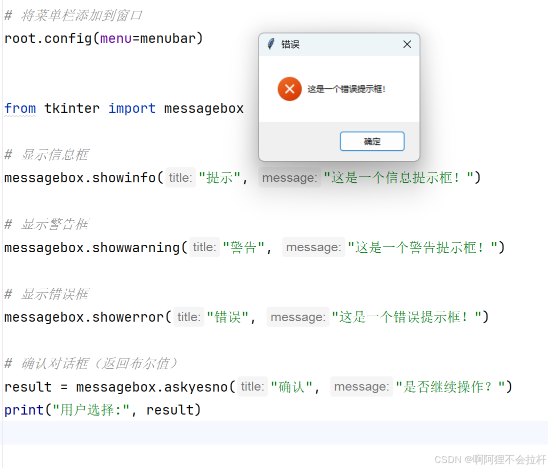 确认框(askyesno) | 需要用户确认是否的操作 | 布尔值(True/False) |