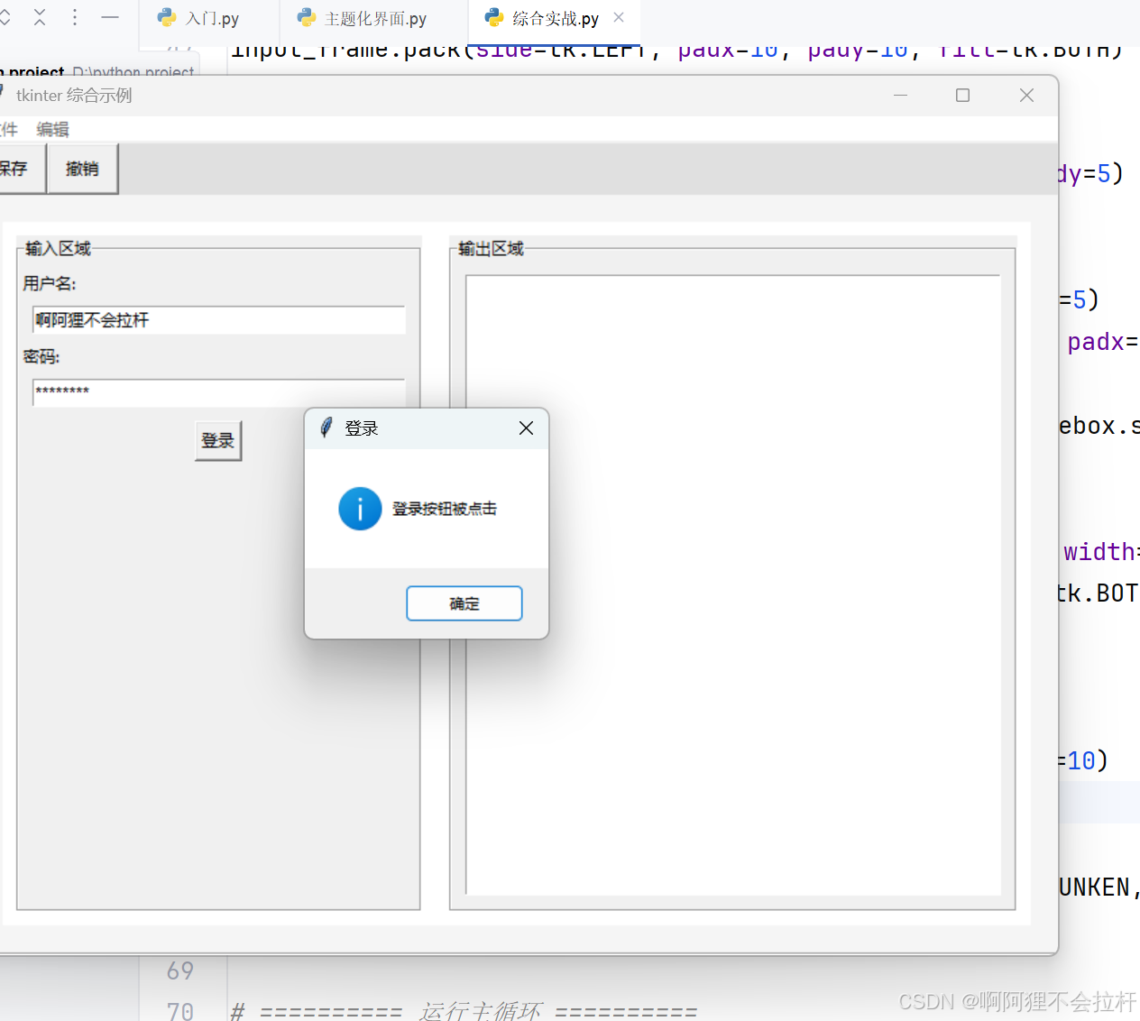 tk.Button(input_frame, text="登录", command=lambda: messagebox.showinfo("登录", "登录按钮被点击")).pack(pady=10)