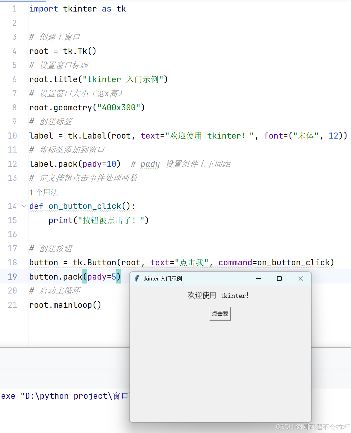 button = tk.Button(root, text="点击我", command=on_button_click)