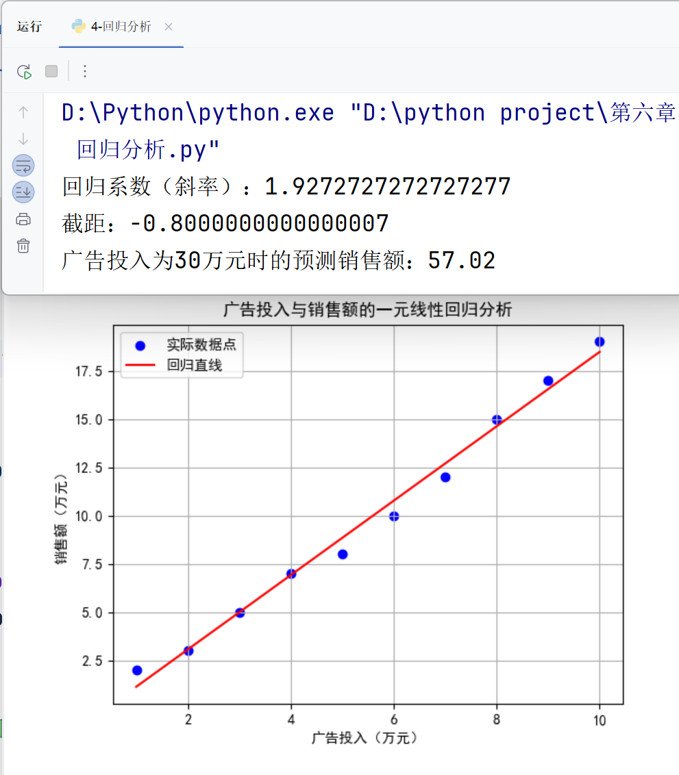 print(f"广告投入为30万元时的预测销售额:{predicted_sales[0]:.2f}")