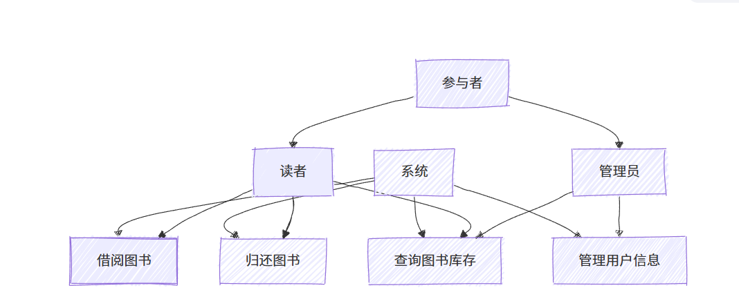用例图是可视化展示用例的工具,通过图形化方式呈现参与者、用例以及它们之间的关系。以下是 “在线图书借阅系统” 的用例图:
