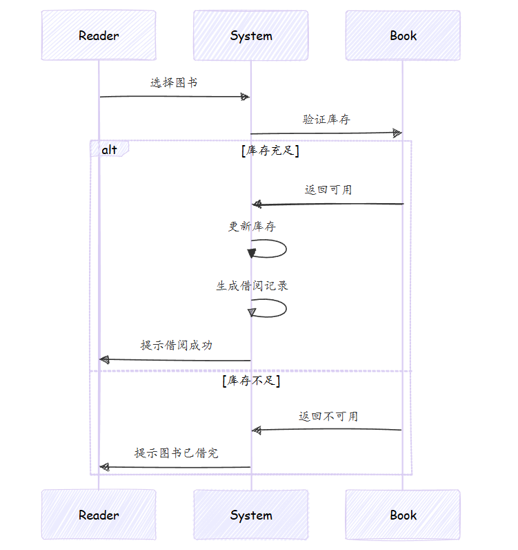使用顺序图详细描述用例中对象之间的交互动作序列。以 “借阅图书” 为例,顺序图如下: