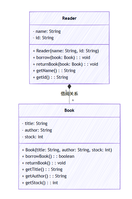 类图用于描述系统中的类、类的属性和方法,以及类之间的关系(如关联、继承、聚合等)。在 “在线图书借阅系统” 中,定义 “图书” 类和 “读者” 类的 Java 代码及对应的类图如下: