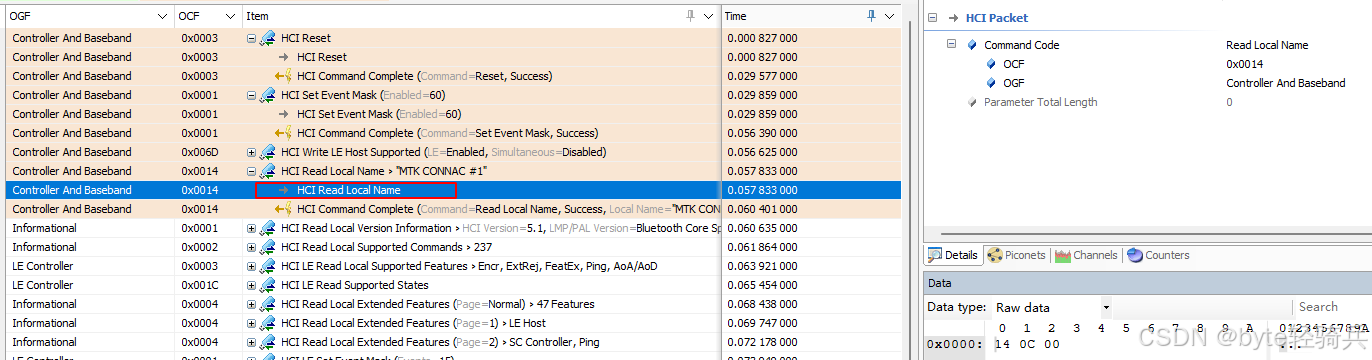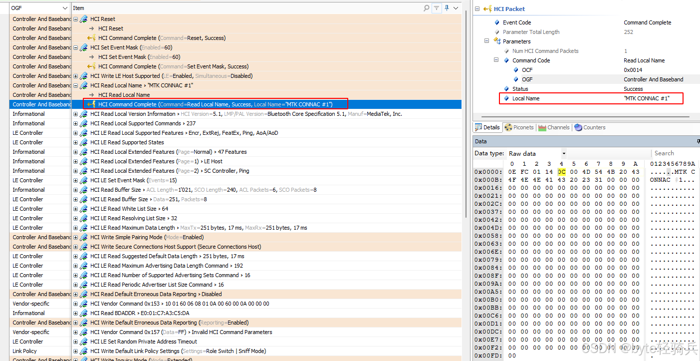 0x01,表示这是一个HCI命令数据包。HCI_Read_Local_Name命令: 0x03(表示Link Control Commands and Link Policy Commands组)0x0014(表示具体的Read Local Name命令)HCI_Read_Local_Name命令,由于它不接受任何参数,因此此字段的值通常为0x00。HCI_Read_Local_Name命令不接受任何参数,因此此部分为空。当HCI_Read_Local_Name命令执行完成后,会生成一个HCI_Command_Complete事件(除非该事件被屏蔽)。这是蓝牙HCI协议中的标准行为。