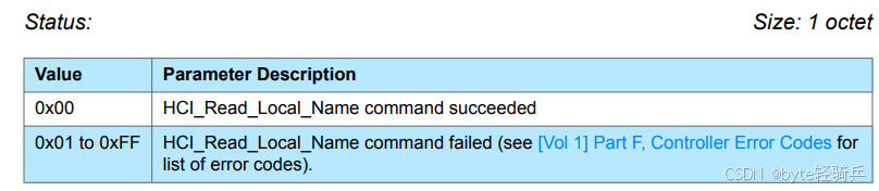 需要注意的是,在使用HCI_Read_Local_Name命令时,应确保蓝牙控制器处于可用状态,并且与主机建立了有效的通信连接。此外,由于不同蓝牙设备和协议栈的实现可能存在差异,因此在实际应用中可能需要参考特定设备或协议栈的文档来正确使用该命令。