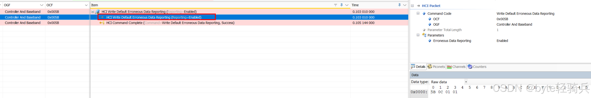 HCI_Write_Default_Erroneous_Data_Reporting命令允许主机(Host)设置蓝牙BR/EDR(Basic Rate/Enhanced Data Rate)控制器在接收到错误数据时的报告行为。这个设置决定了控制器是否会在HCI数据包的状态标志中反映数据包的错误状态。