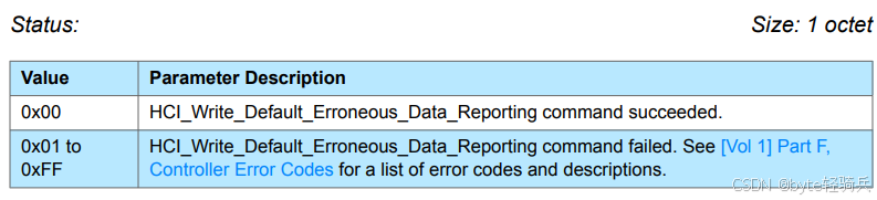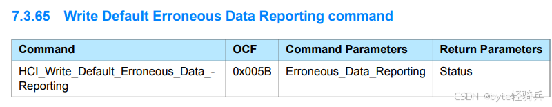 HCI_Write_Default_Erroneous_Data_Reporting命令格式HCI_Write_Default_Erroneous_Data_Reporting命令遵循蓝牙核心规范中定义的HCI命令结构。