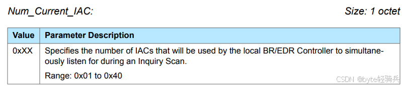 0x01,表示设置1个IAC。0x40,表示设置64个IAC。设置的IAC数量不应超过蓝牙设备支持的最大IAC数量。如果 Num_Current_IAC 的值超过了设备支持的最大数量,则蓝牙控制器可能会忽略超出部分,或者返回一个错误代码。在实际使用中,应根据需要监听的IAC数量来设置 Num_Current_IAC。过多的IAC可能会增加查询扫描的复杂性和功耗,而过少的IAC可能会限制设备发现的灵活性。