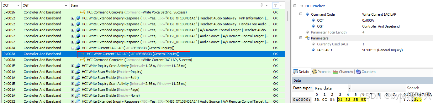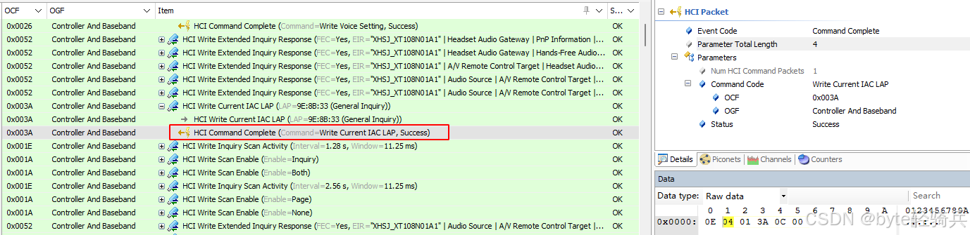 HCI_Write_Current_IAC_LAP 命令成功执行。表示本地BR/EDR控制器已经成功更新了其当前使用的IAC(Inquiry Access Codes,查询访问码)LAP(Logical Address Part,逻辑地址部分)列表。