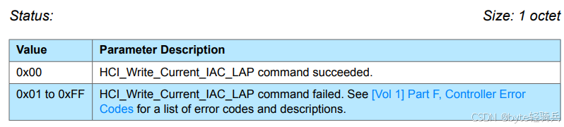 HCI_Command_Complete事件。HCI_Write_Current_IAC_LAP命令,通常不包含返回参数,但事件的存在本身表明了命令的完成状态。0x00表示成功,其他值表示失败,并伴随有特定的错误代码。Status 参数是 HCI_Write_Current_IAC_LAP 命令执行结果的重要反馈。