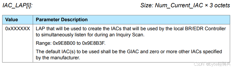IAC_LAP[i] 是 HCI_Write_Current_IAC_LAP 命令中的一个参数数组,用于指定本地BR/EDR控制器在查询扫描期间将监听的查询访问码(IAC)的逻辑地址部分(LAP)。