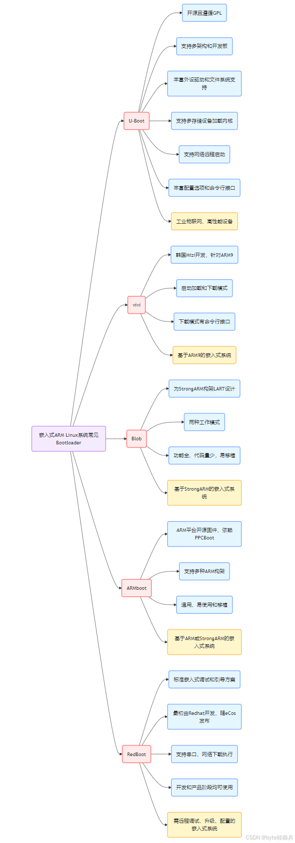 功能特点 : 支持从多种存储设备中加载内核镜像,如Flash存储器、硬盘等。 可以通过网络进行远程启动,方便进行远程系统升级和设备部署。 提供了丰富的配置选项和命令行接口,方便开发者进行调试和定制。 应用场景 :在工业物联网设备的批量生产中,U-Boot可以方便地对大量设备进行内核更新和配置。同时,它也广泛应用于智能手机、平板电脑等高性能嵌入式设备中。3.2. vivi 特点 :vivi是由韩国Mizi公司开发的一种Bootloader,专门针对ARM9处理器而设计,支持S3C2410x处理器。提供了两种工作模式:启动加载模式和下载模式 。在下载模式下,vivi为用户提供一个命令行接口,方便用户进行调试和烧写操作。应用 :vivi主要应用于基于ARM9处理器的嵌入式系统中。3.3. Blob(BootLoader Object) 特点 :Blob是由Jan-Derk Bakker和Erik Mouw发布的Bootloader,专为StrongARM构架下的LART设计。它支持SA1100的LART主板,但用户也可以自行修改移植。Blob提供了两种工作模式,并具备较齐全的功能和较少的代码量,适合进行修改移植来引导Linux系统。应用 :Blob主要应用于基于StrongARM构架的嵌入式系统中,如S3C44B0板等。3.4. ARMboot 特点 :ARMboot是一个ARM平台的开源固件项目,它严重依赖于PPCBoot。ARMboot支持的处理器构架有StrongARM、ARM720T、PXA250等,是为基于ARM或StrongARM CPU的嵌入式系统所设计的。ARMboot的目标是成为通用的、容易使用和移植的引导程序,非常轻便地运用于新的平台上。应用 :ARMboot应用于基于ARM或StrongARM处理器的嵌入式系统中,提供了一个轻便且功能完备的引导解决方案。3.5. RedBoot 特点 :RedBoot是标准的嵌入式调试和引导解决方案,是一个专门为嵌入式系统定制的引导工具。它最初由Redhat开发,是嵌入式操作系统eCos的一个最小版本,并随eCos发布。RedBoot支持串口、网络下载和执行嵌入式应用程序,既可以用在产品的开发阶段(调试功能),也可以用在最终的产品上(Flash更新、网络启动)。应用 :RedBoot广泛应用于各种嵌入式系统中,特别适用于需要远程调试、升级和配置的场景。四、典型问题解决方案 4.1 启动卡死问题排查 ①串口日志分析