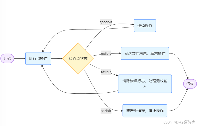每个流对象都有一个关联的条件状态(Condition State),它是一个用于描述流当前状态的标志集合。这些标志位反映了流在进行 IO 操作时的各种情况,例如操作是否成功、是否遇到文件末尾、是否发生错误等。通过检查这些标志位,可以了解流的状态,并根据不同的状态采取相应的处理措施