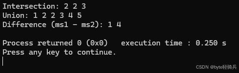 虽然 multiset 本身没有直接提供交集、并集和差集操作的方法,但可以使用标准库中的算法来实现这些操作: