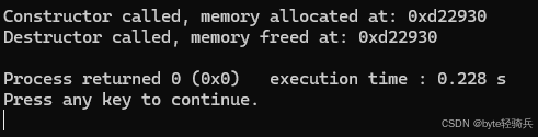 } // 对象销毁时内存未释放析构函数是类的一个特殊成员函数,它的名称与类名相同,但前面带有波浪号(~)。析构函数没有返回值,也不能有参数,因此每个类只能有一个析构函数。其基本语法如下: