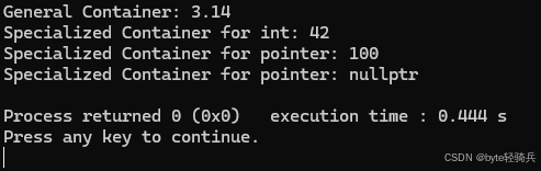 std::cout << "Specialized Container for pointer: nullptr" << std::endl;