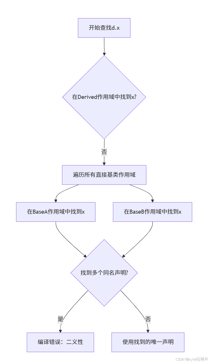 在多重继承中,派生类有多个直接基类(如BaseA和BaseB),名字查找会同时遍历所有直接基类的作用域。若多个基类的作用域中存在同名的成员,且这些成员在派生类中未被覆盖,则编译器无法确定应选择哪个基类的成员,导致二义性错误(编译失败)。