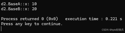 std::cout << "d2.BaseB::x: " << d2.BaseB::x << std::endl; // 输出20