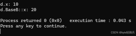 std::cout << "d.BaseB::x: " << d.BaseB::x << std::endl; // 仍可显式访问BaseB的x